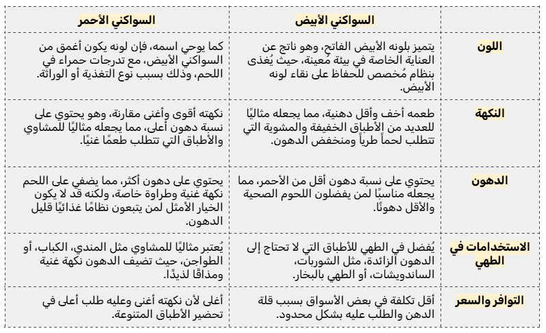 باختصار، إذا كنت تبحث عن لحم أخف وأقل دهونًا، فإن السواكني الأبيض هو الأنسب لك، أما إذا كنت تفضل نكهة أقوى ودهونًا غنية، فاختيار السواكني الأحمر سيكون خيارًا ممتازًا.